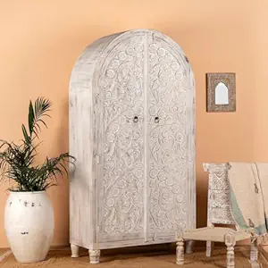 The Noziya wardrobe is a beautiful combination of skill and elegance. It’s carefully crafted from mango wood and has a unique rounded shape that makes it stand out. The white washed finish adds a touch of sophistication, and the detailed hand-carved designs showcase tradition and craftsmanship.