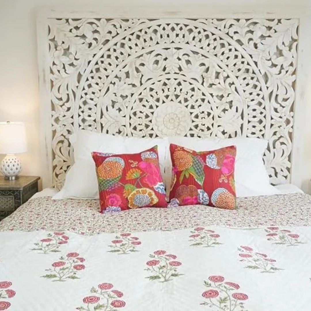 Noziya Carved Head Board Bed with No Stroage Antique Wooden Mango Wood Bed