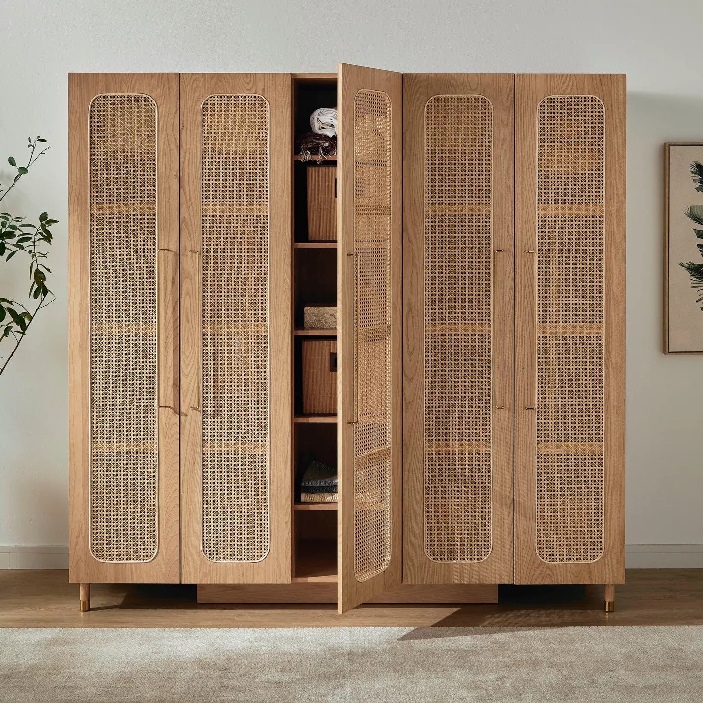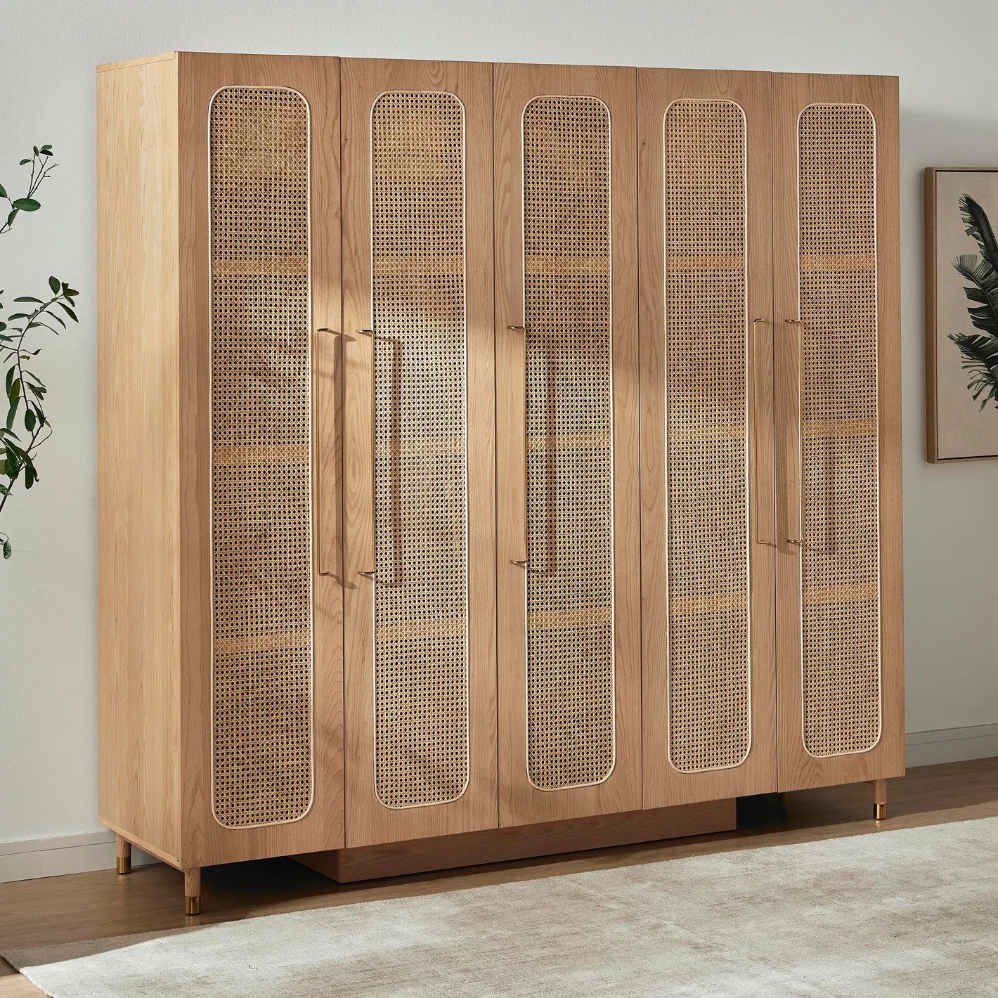 Noziya Furniture Solid Mango Wooden Rattan Wardrobe, a stunning blend of functionality and elegance designed to meet all your storage needs. Crafted from high-quality solid mango wood, this wardrobe showcases a beautiful natural finish that highlights the unique grain patterns, bringing warmth and sophistication to your space. Featuring five generous doors, this wardrobe provides ample storage capacity, making it ideal for organizing your clothing, accessories, and linens. The intricately woven rattan panels add a stylish touch, creating a beautiful contrast with the solid wood while ensuring ventilation for your garments. With its spacious interior, you can easily arrange your wardrobe essentials, from hanging clothes to neatly folded items. The thoughtfully designed compartments maximize organization, allowing you to find what you need effortlessly. The Noziya wardrobe’s timeless design complements a variety of decor styles, from contemporary to rustic, making it a versatile addition to any bedroom. Its robust construction promises durability, ensuring that this wardrobe will be a cherished piece in your home for years to come. Emphasizing sustainability, Noziya Furniture is committed to responsible sourcing, allowing you to invest in a beautiful piece that aligns with eco-friendly practices. Discover the perfect blend of style and functionality with the Noziya Solid Mango Wooden Rattan Wardrobe, a statement piece that transforms your bedroom into a serene and organized sanctuary.