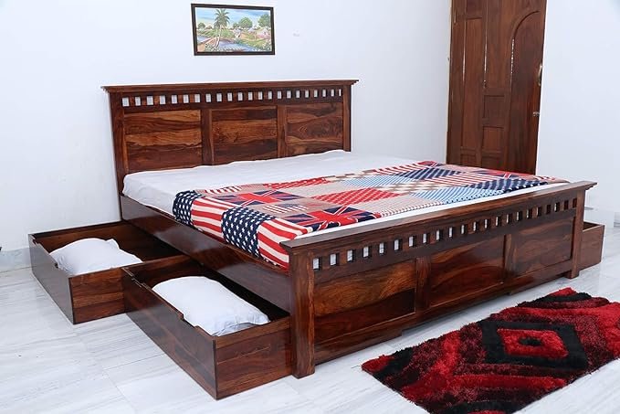 Noziya Solid Sheesham Wood King Size Bed with Four Drawer Storage for Bedroom, Hotel & Home