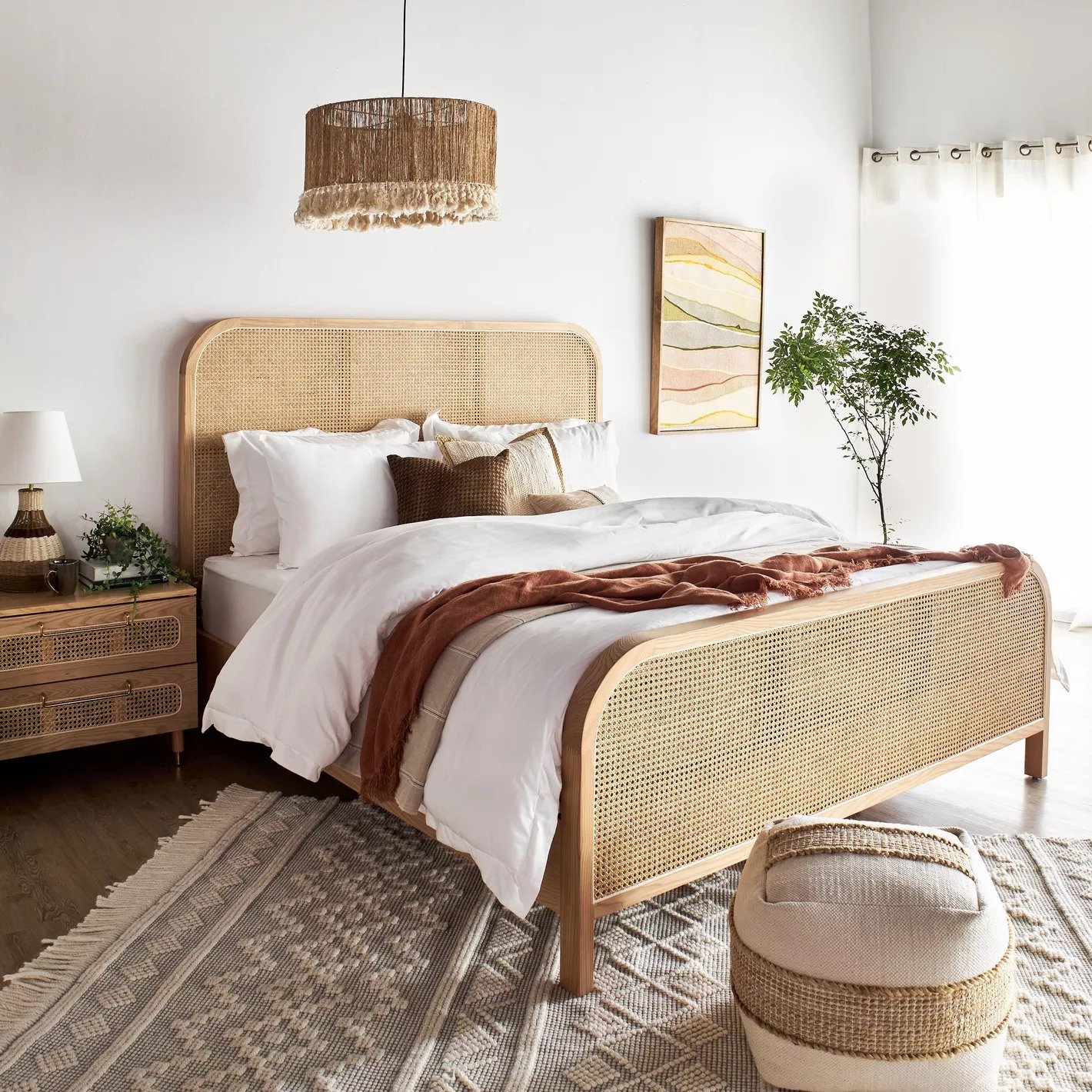 Noziya Furniture Mango Wooden Rattan King Size Bed , Natural Finish