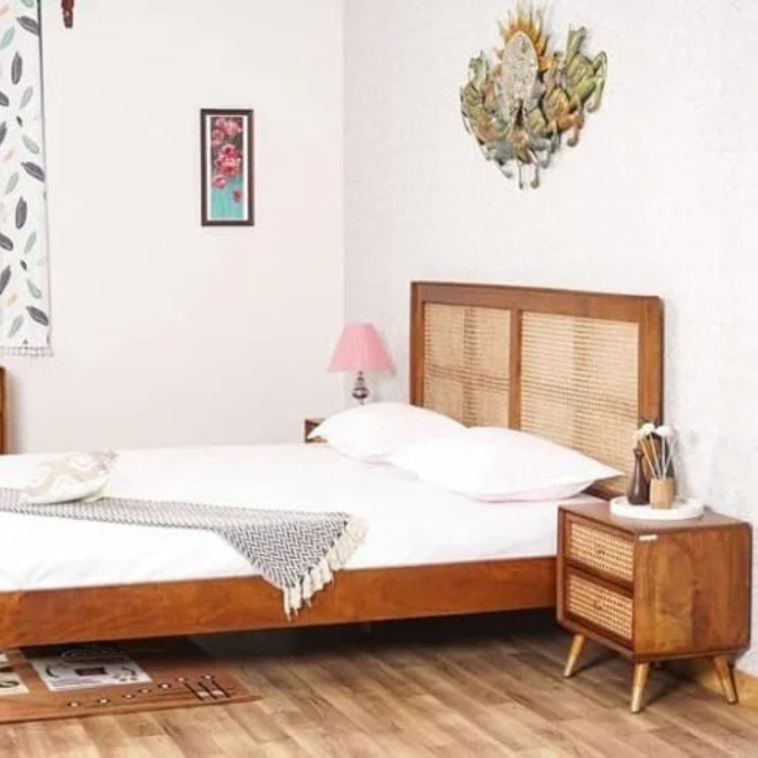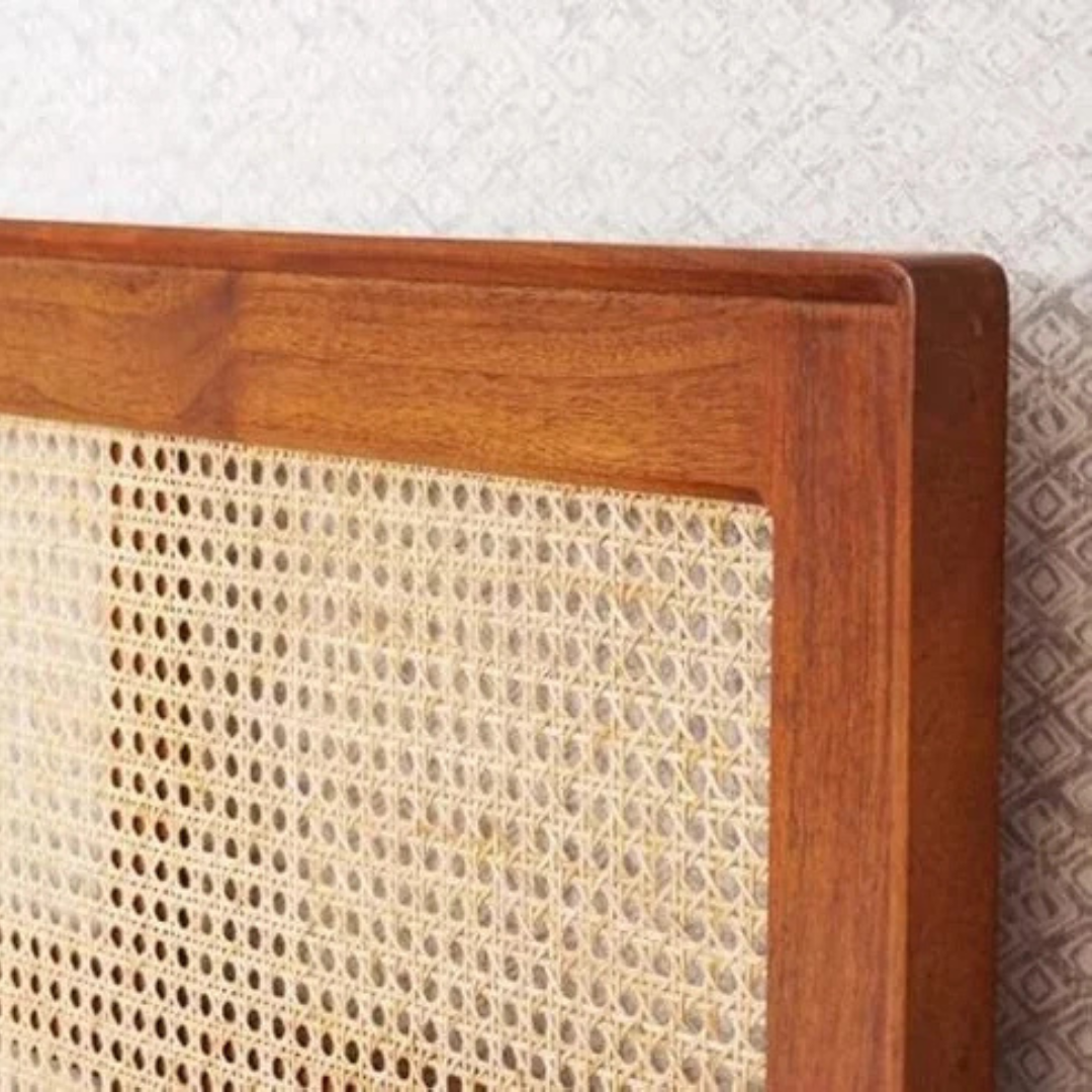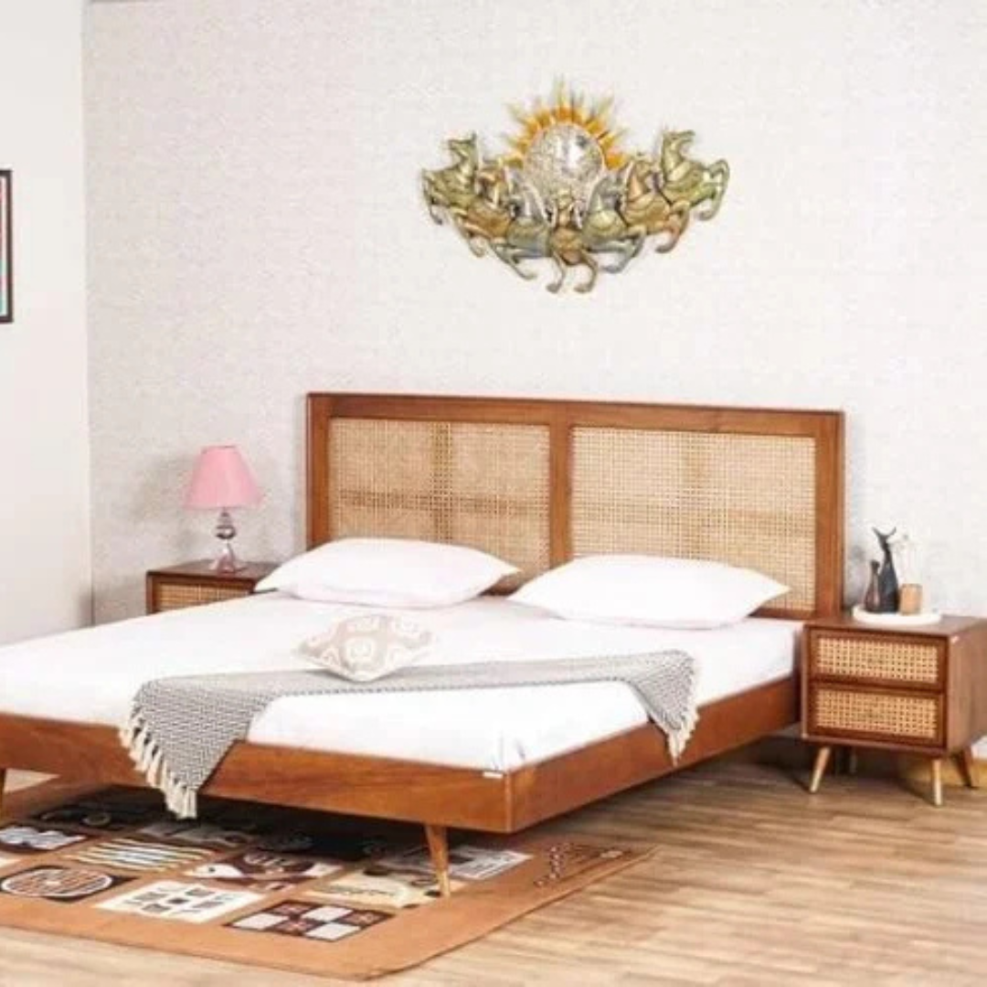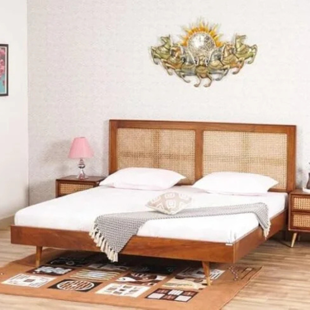 Noziya Solid Sheesham Wooden King Size Bed with Rattan Headboard & Without Storage Box for Bedroom, Hotel & Home