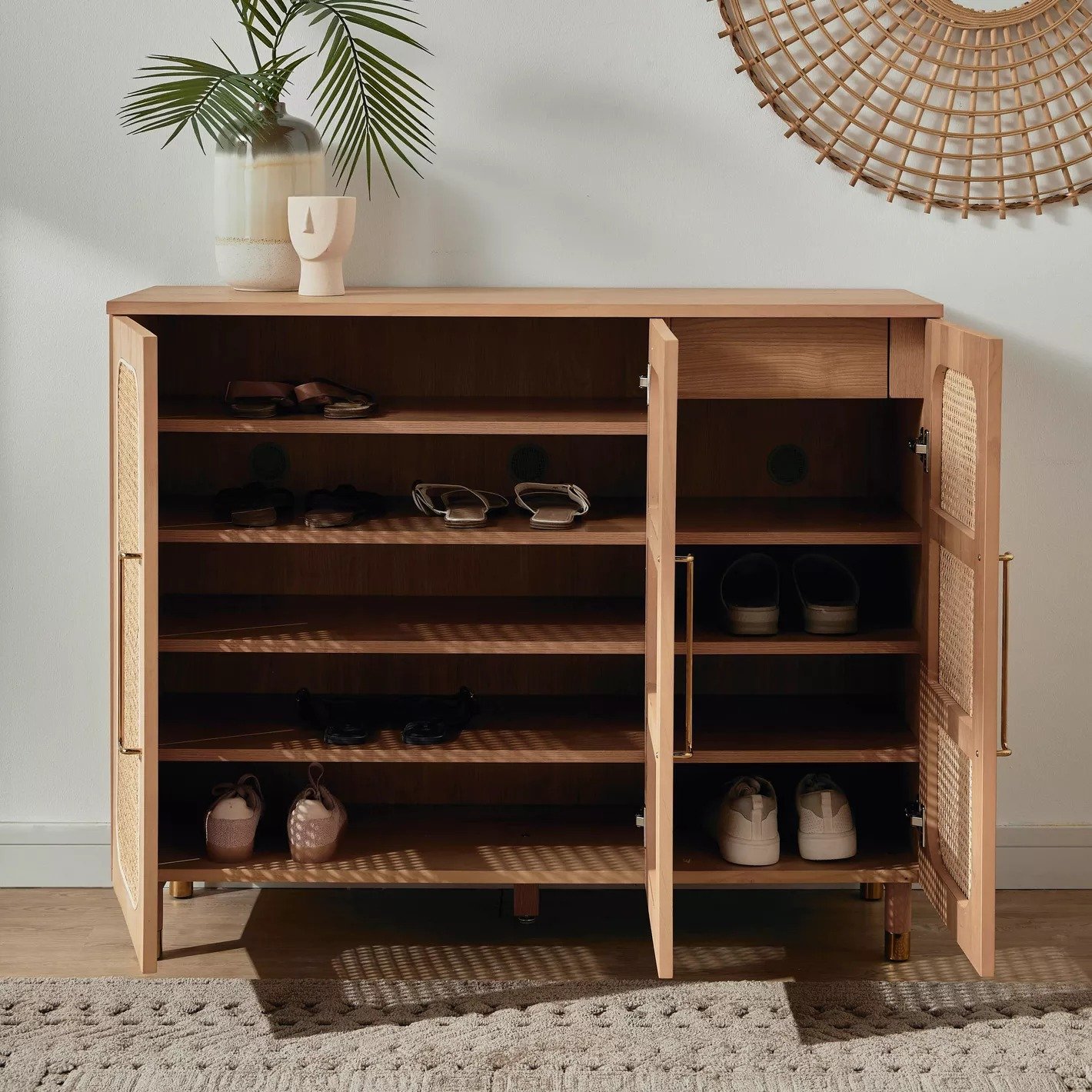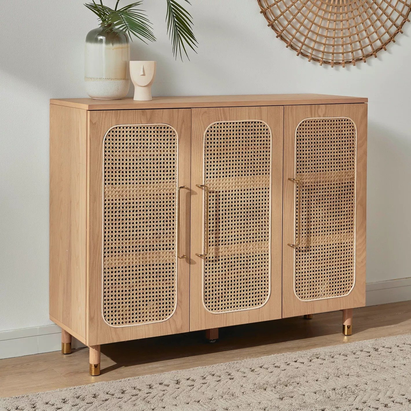Noziya Furniture Solid Mango Wooden Rattan Storage Cabinet in Natural Finish