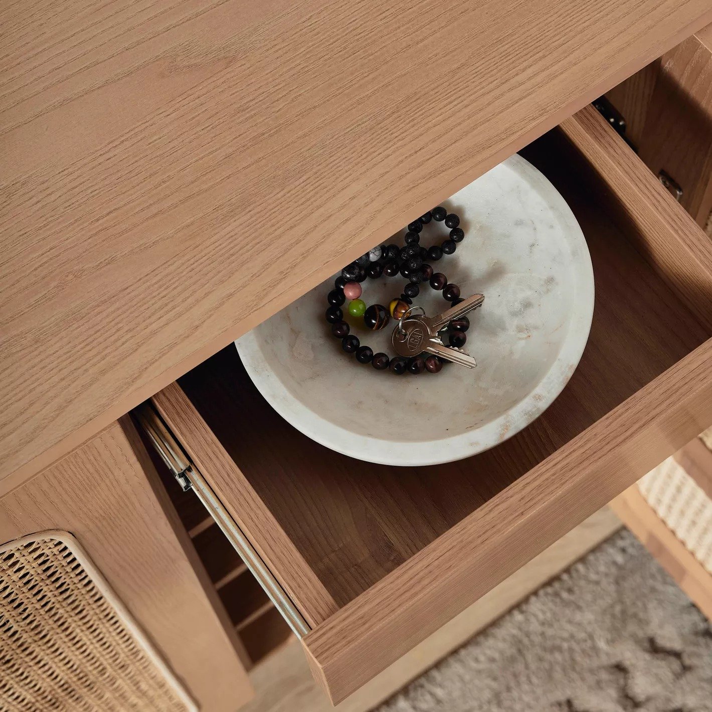 Noziya Furniture Solid Mango Wooden Rattan Storage Cabinet, an exquisite blend of style and functionality. Crafted from premium solid mango wood, this cabinet showcases a beautiful natural finish that accentuates the unique grain patterns of the wood, creating a warm and inviting atmosphere.Designed with three spacious drawers, this cabinet offers ample storage for a variety of items, from clothing and linens to books and accessories. Each drawer features elegant woven rattan fronts, adding a touch of texture and a chic, bohemian flair to the overall design. This thoughtful combination of materials not only enhances the cabinet’s aesthetic but also ensures durability and longevity. The Noziya storage cabinet boasts a sleek, versatile design that fits seamlessly into any decor style, whether modern, rustic, or coastal. Its compact size makes it perfect for bedrooms, living rooms, or entryways, providing both practical storage solutions and a stylish accent to your space. Easy to maintain and built with sustainability in mind, this cabinet reflects Noziya Furniture’s commitment to quality craftsmanship and eco-friendly practices. Elevate your home decor with the Noziya Solid Mango Wooden Rattan Storage Cabinet, where timeless design meets everyday functionality.
