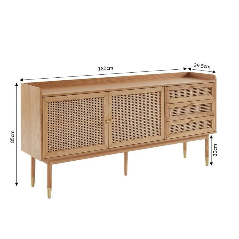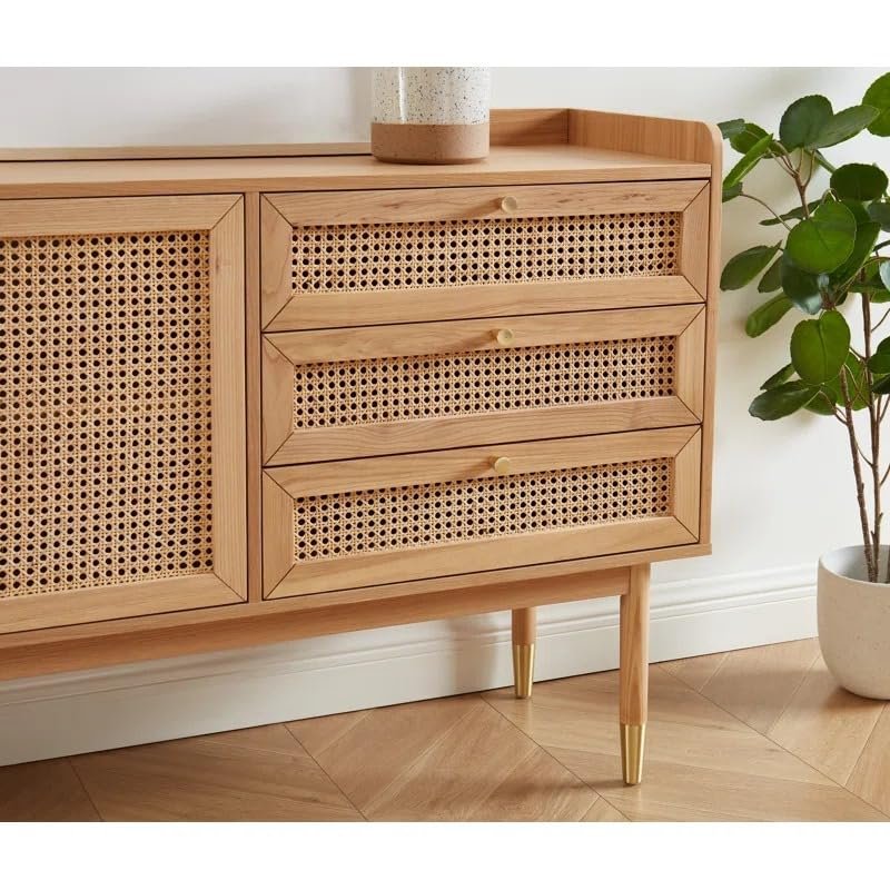 Noziya Furniture Solid Sheesham Wooden Rattan Sideboard Cabinet, a stylish and practical addition to your home decor. Crafted from high-quality Sheesham wood and finished in a natural tone, this cabinet showcases the wood’s rich grain and warm hues. It features intricate rattan detailing on the doors, adding a touch of artisanal elegance. With two doors and three drawers, it offers ample storage space for organizing a variety of items, from dining essentials to personal belongings. Perfect for enhancing your living room, dining area, or hallway, this sideboard combines classic design with functional storage, making it a versatile and sophisticated choice for any interior.